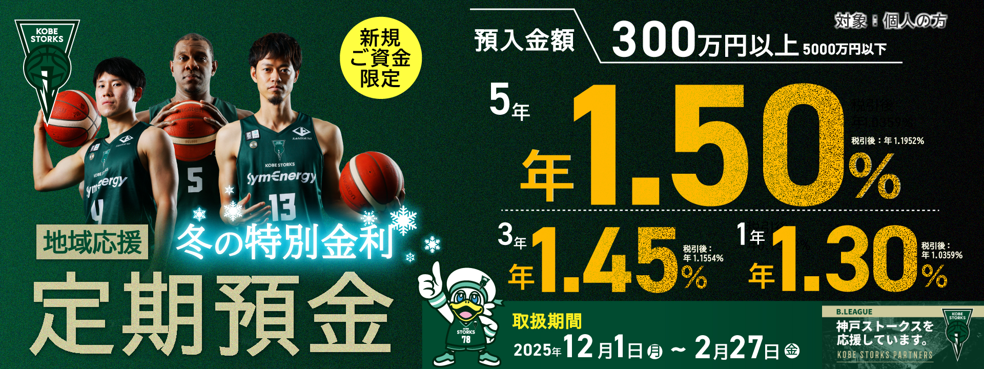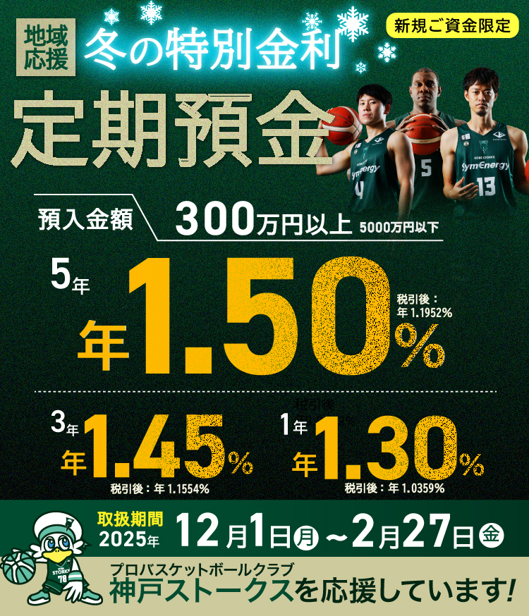 満期日に当初預入時と同一期間の 「神戸ストークス応援定期預金」で自動継続します。 ただし、満期日当日に「神戸ストークス応援定期預 金」を発売していない場合は、 スーパー定期預金として店頭表示金利でいたします。 |